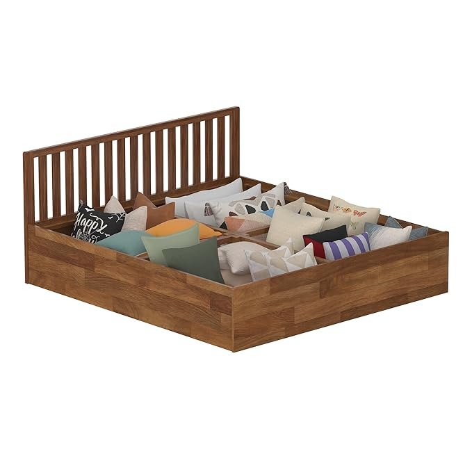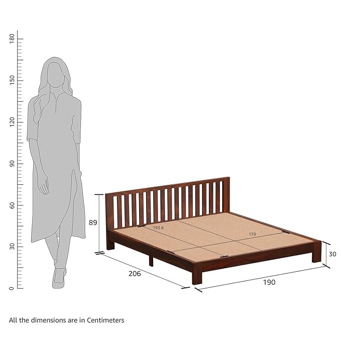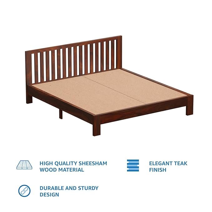 - Material: Sheesham Solid Wood with a premium teak finish. Mattress support is MDF board